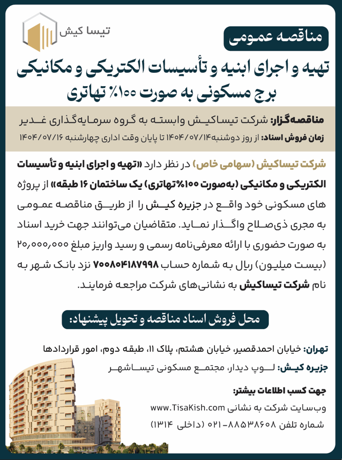 شرکت تیساکیش (سهامی خاص) وابسته به گروه سرمایه‌گذاری غدیر، در راستای تکمیل مراحل عمرانی پروژه‌های شاخص خود در جزیره زیبای کیش، فراخوان مناقصه عمومی “تهیه و اجرای ابنیه و تأسیسات الکتریکی و مکانیکی یک برج مسکونی به‌صورت ۱۰۰٪ تهاتری” را منتشر کرد.
